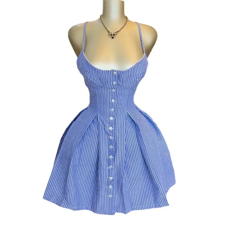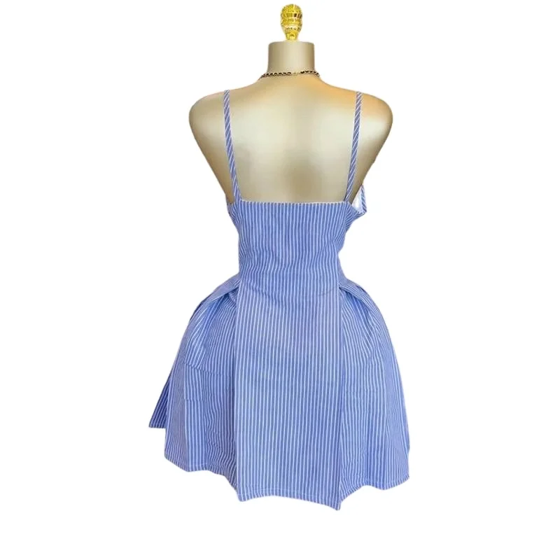 Women Summer New Fashion Elegant Sweet High Quality Blue Striped A-Line Casual Dress